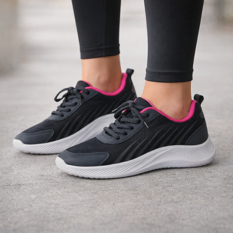 رنگهای مشکی با بخش داخلی صورتی و کفی سفید باعث شده ظاهر کفش خاص و چشمگیر باشد.